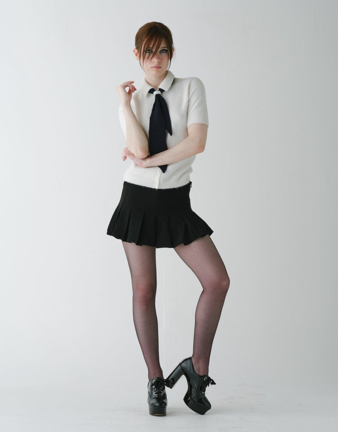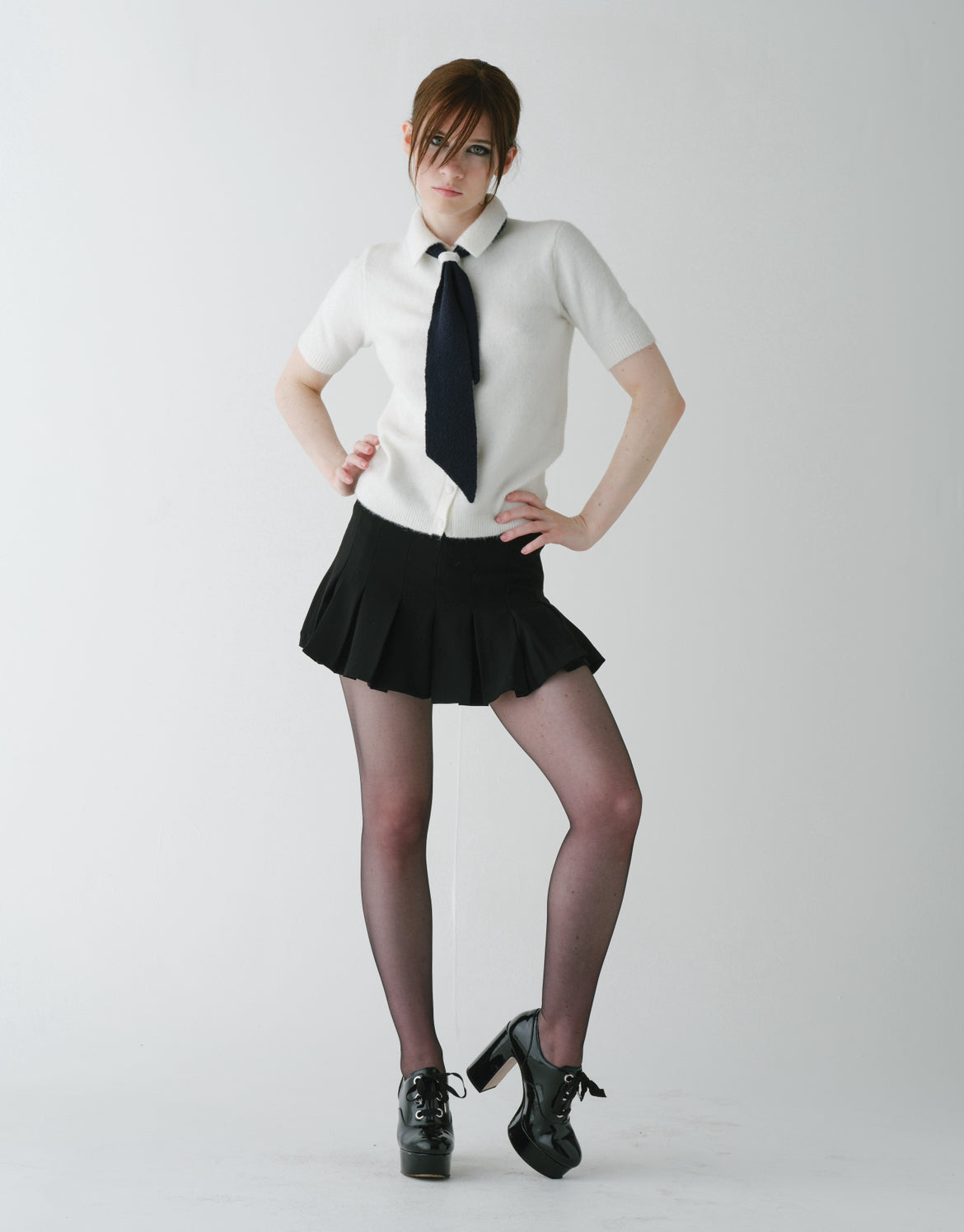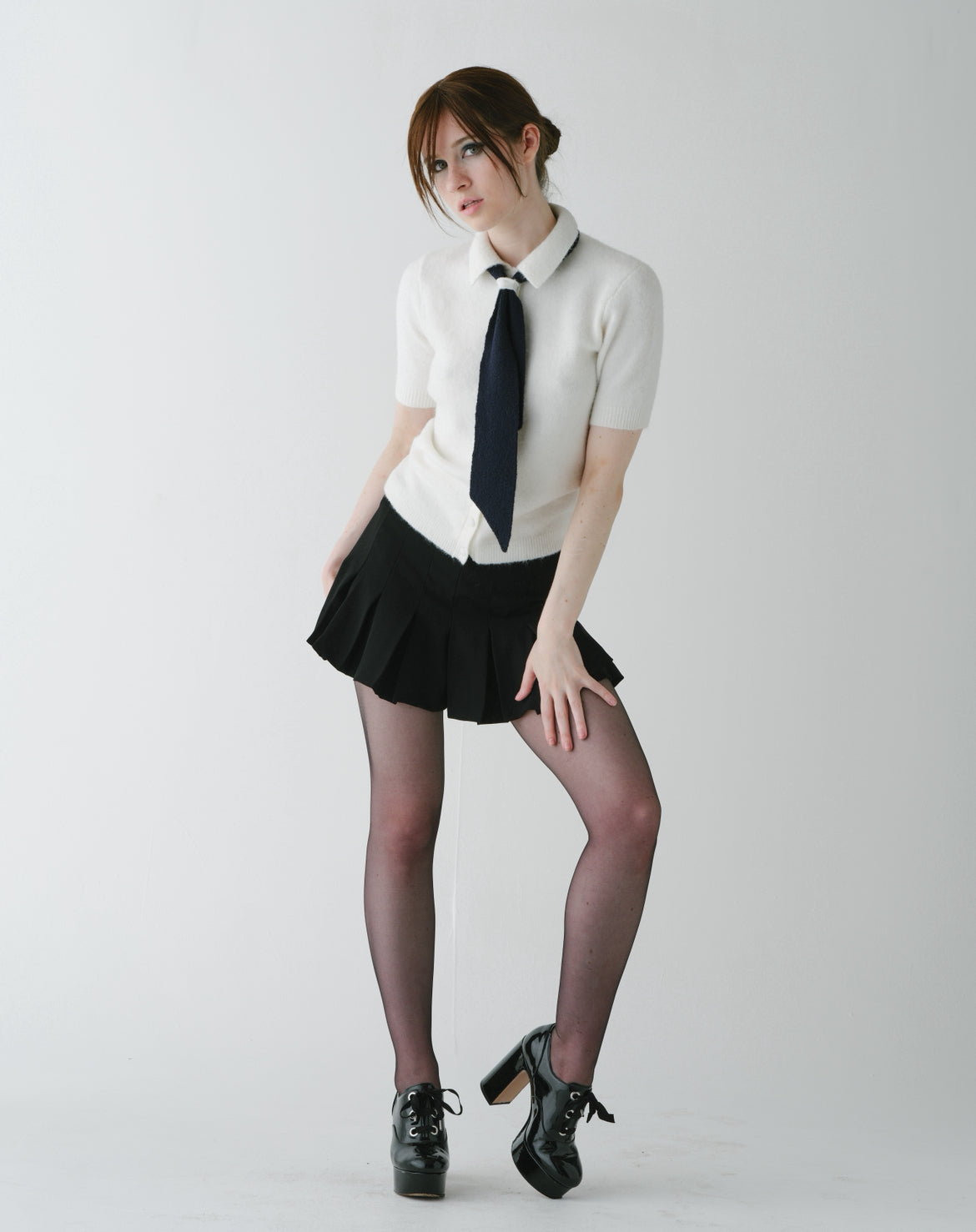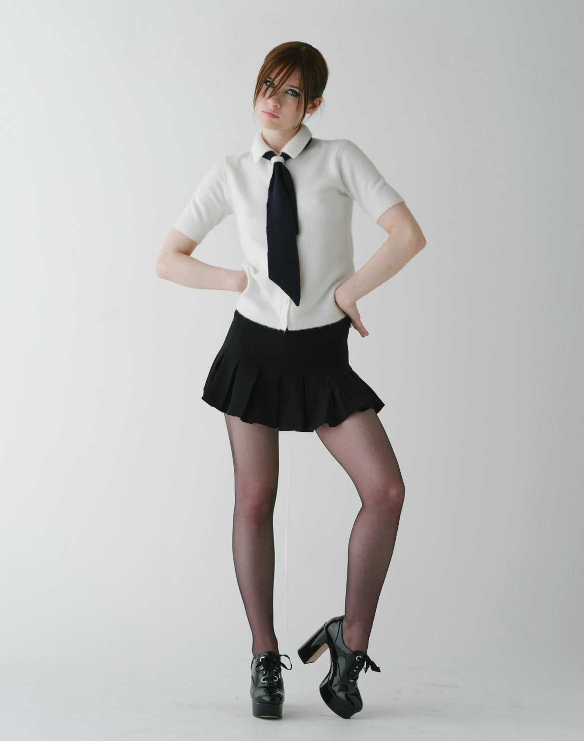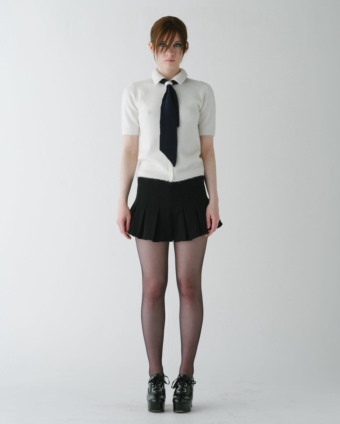 51% POLYESTER 39 %ACRYLIC WOOL 3% SPANDEX Fluffy fuzzy non itchy cream sweater with Navy neck tie - functional buttoning down center.